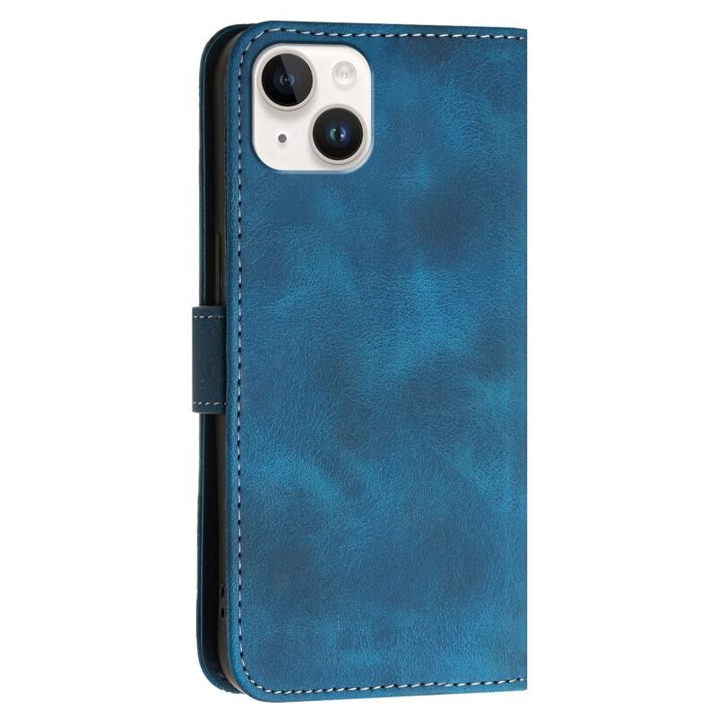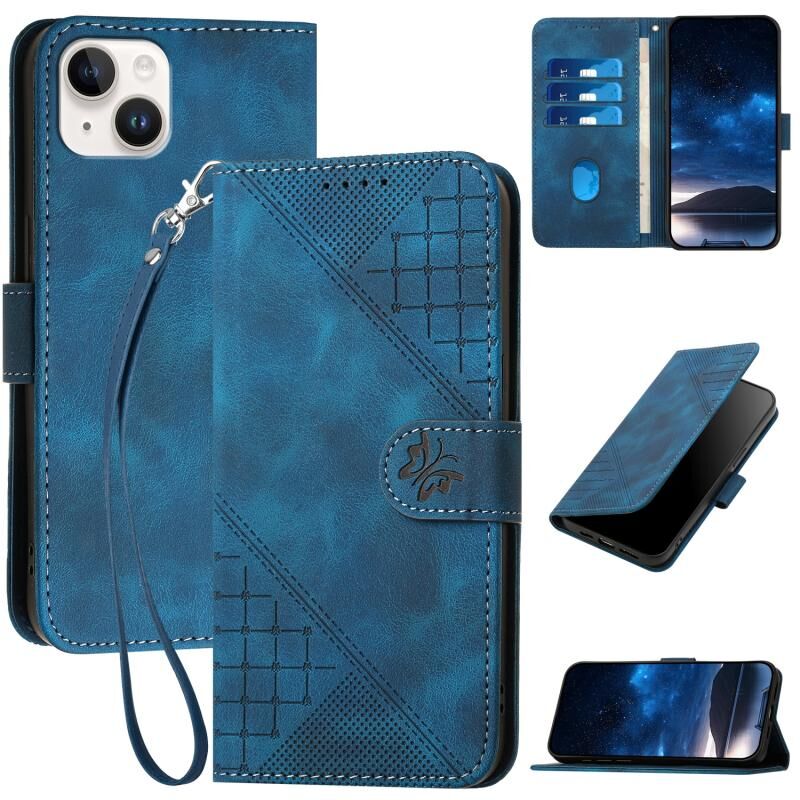Θήκη τηλεφώνου τύπου flip από δέρμα με ανάγλυφο σχέδιο πλέγματος και πεταλούδας για iPhone 14 Plus YX0080 με κορδόνι (Σκούρο Μπλε)