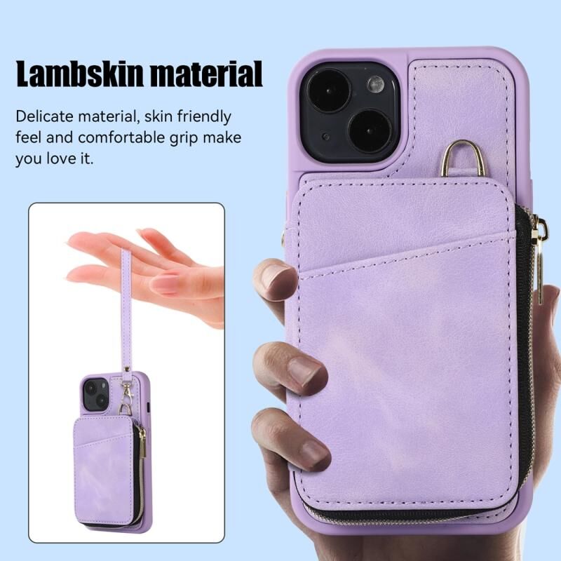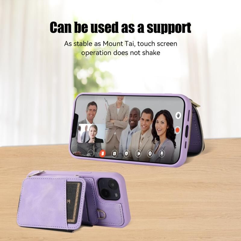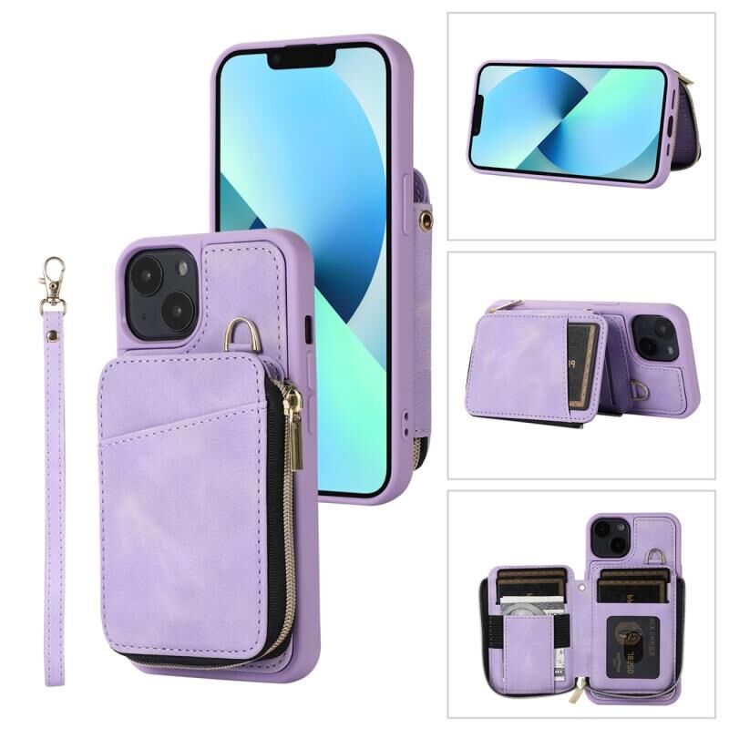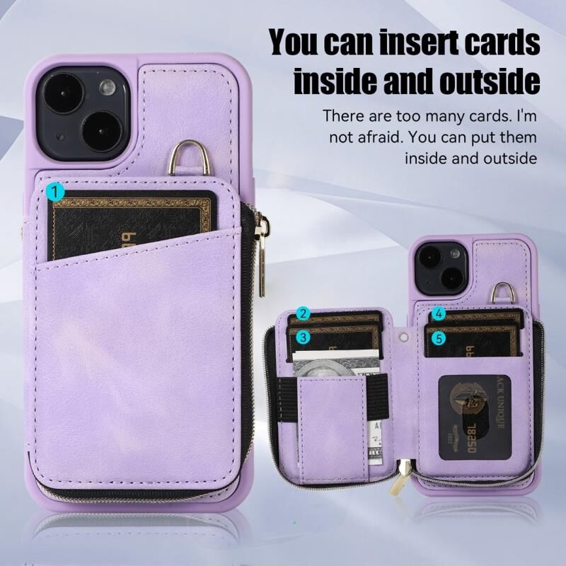 For iPhone 14 Plus Zipper Card Bag Back Cover Phone Case(Purple)