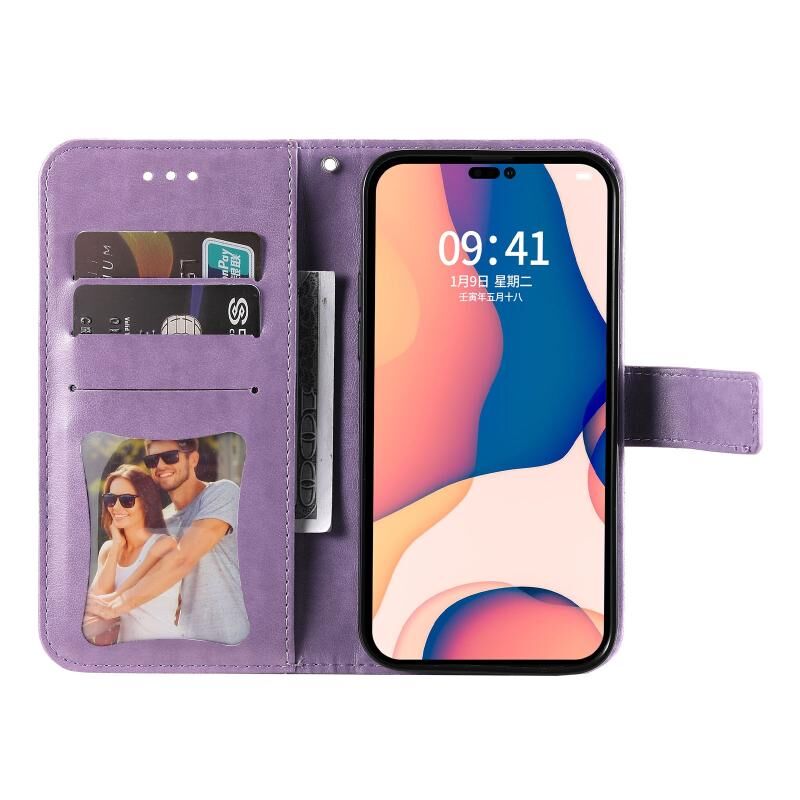 Θήκη δέρματος με ανάγλυφα 7 πέταλα λουλουδιών για iPhone 14 Pro (Ανοιχτό Μωβ)