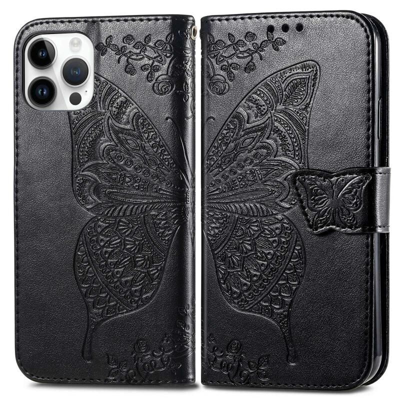 Θήκη δέρματος με ανάγλυφο σχέδιο πεταλούδας για iPhone 14 Pro (Ροζ)