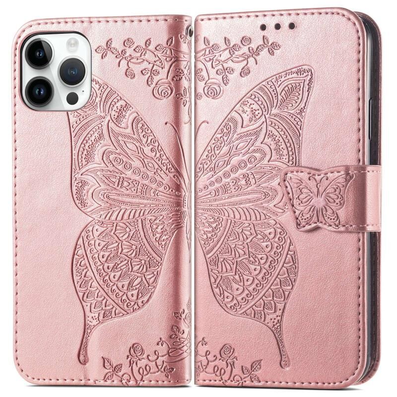 Θήκη δέρματος με ανάγλυφο σχέδιο πεταλούδας για iPhone 14 Pro (Ροζ)
