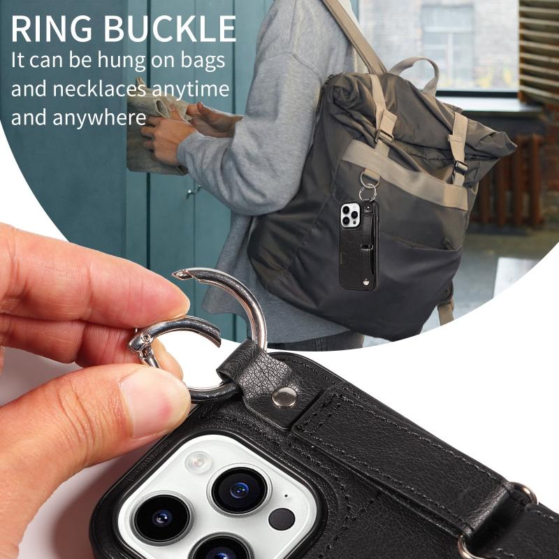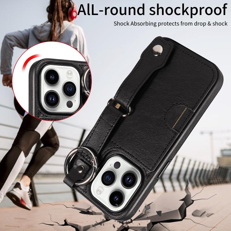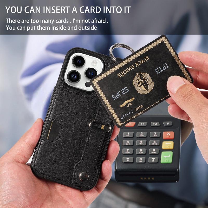 For iPhone 14 Pro Calf Texture Wrist Card Slot Ring Phone Case(Black)