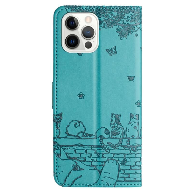 For iPhone 14 Pro Cat Embossing Pattern Leather Phone Case with Lanyard(Blue)
