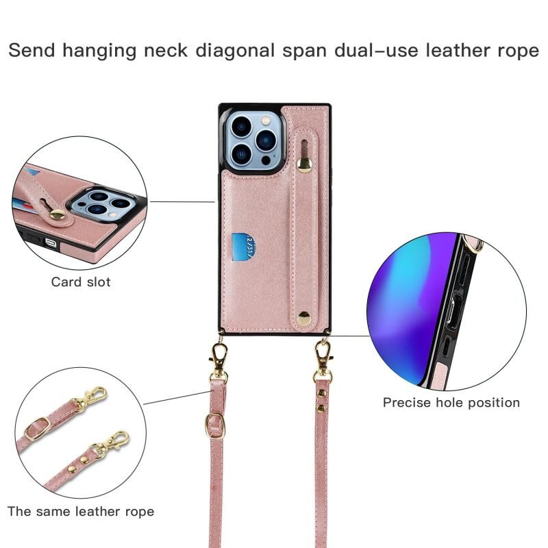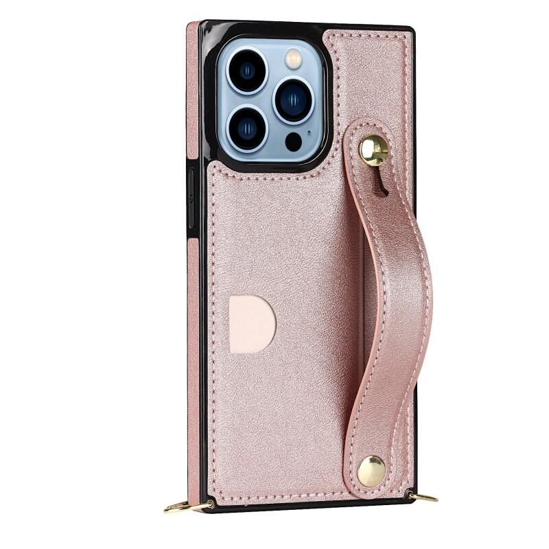 Θήκη τηλεφώνου για iPhone 14 Pro με λουρί καρπού και θήκη καρτών (Χρυσό ροζ)