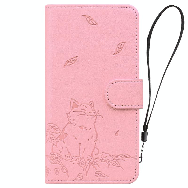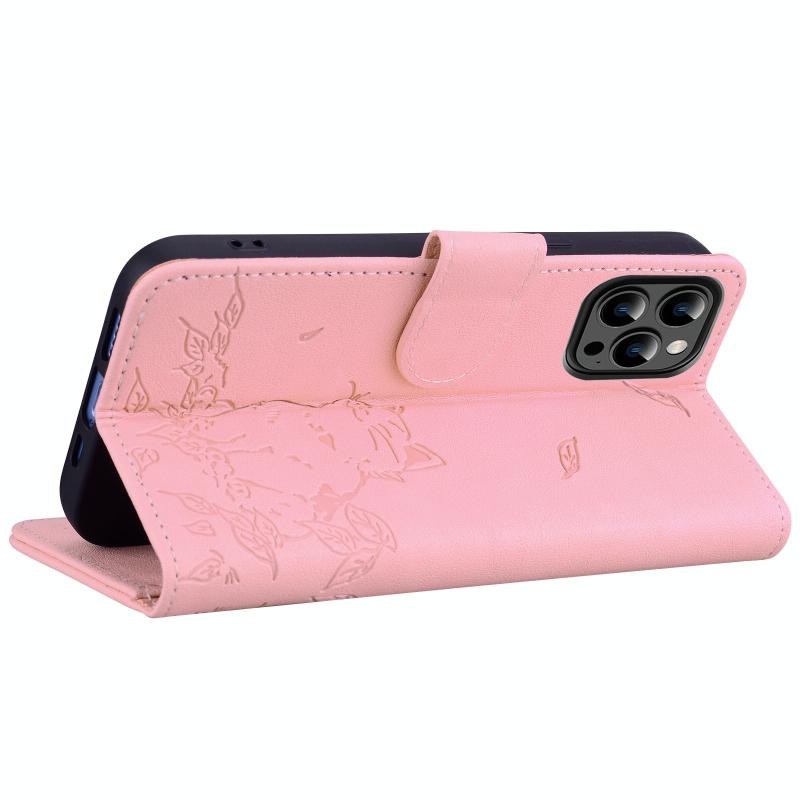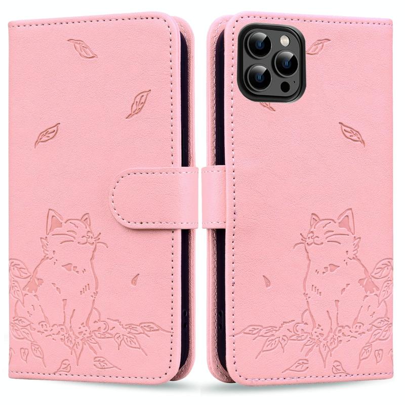Θήκη iPhone 14 Pro Δερμάτινη με Χαριτωμένο Σχέδιο Γάτας (Ροζ)