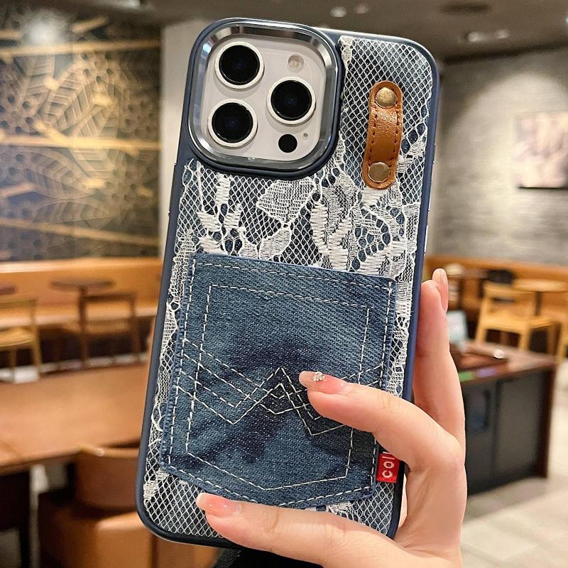 Θήκη iPhone 14 Pro με σχέδιο τσέπης από denim και δέρμα (Ρουά Μπλε)