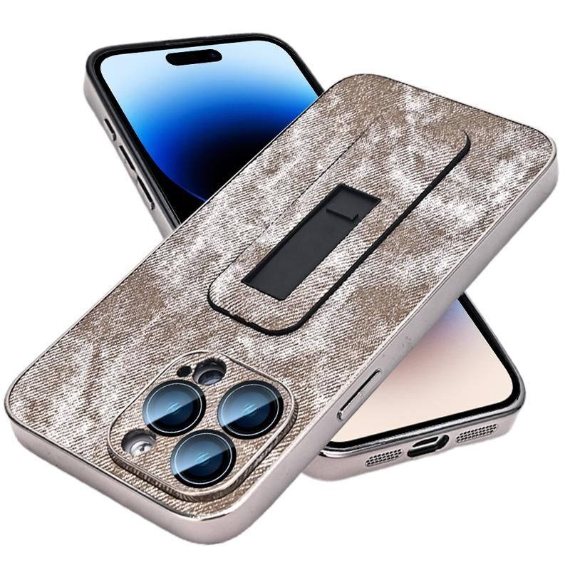 For iPhone 14 Pro Denim Pattern Electroplated Push-pull Bracket Cooling Phone Case(Grey)