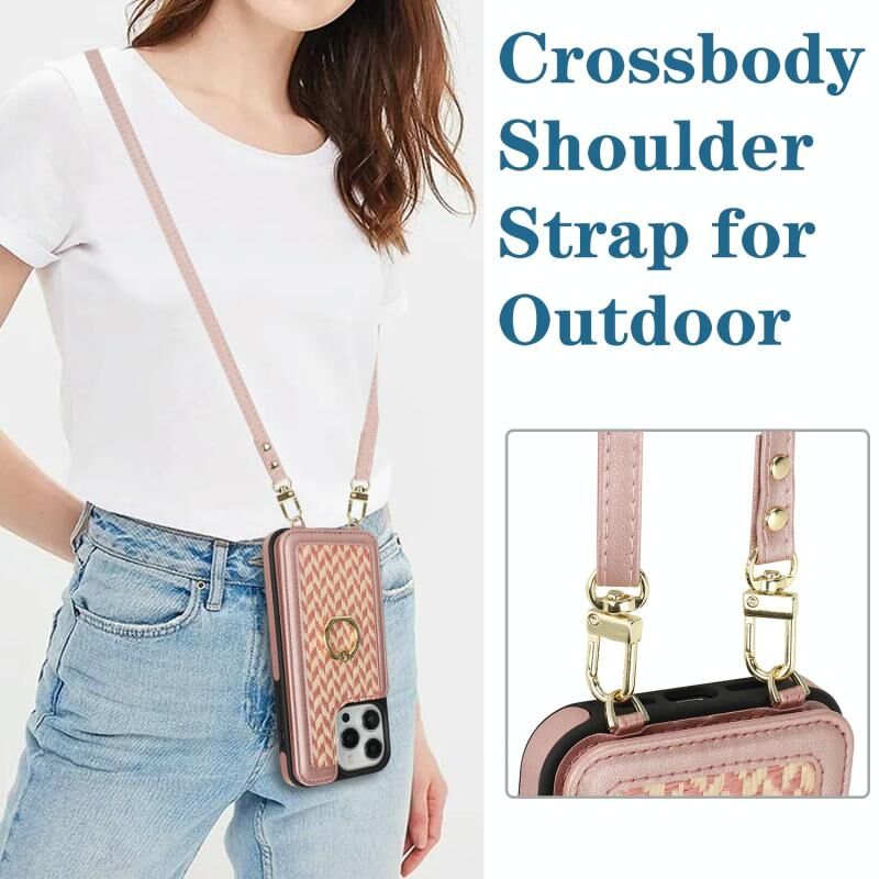 Θήκη κινητού τηλεφώνου πλήρους κάλυψης με διπλή θήκη για κάρτες και λουρί crossbody για iPhone 14 Pro (Χρυσορόδινο)