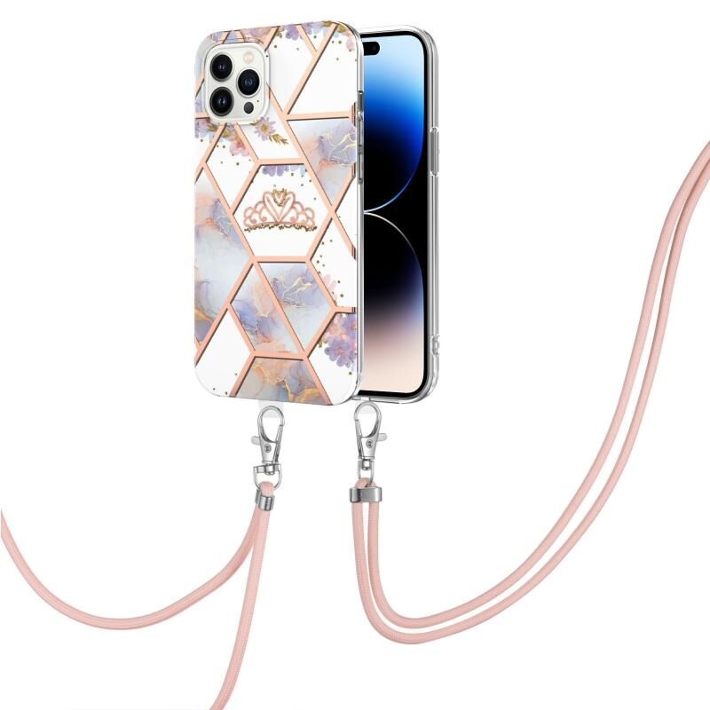 Θήκη για iPhone 14 Pro με ηλεκτρολυτική επιμετάλλωση, συνδυασμό μαρμάρου και λουλουδιών, από TPU με προστασία από κραδασμούς και λουρί (Imperial Crown).