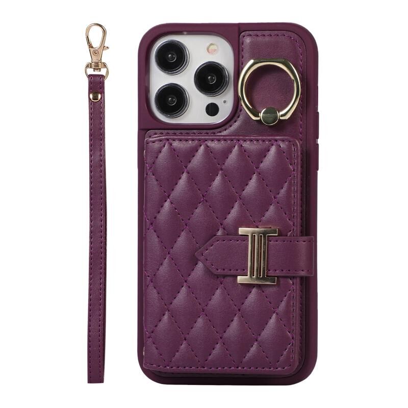 Θήκη κινητού τηλεφώνου με δακτύλιο στήριξης και διπλό κορδόνι για iPhone 14 Pro, οριζόντια τσέπη για κάρτες (Μωβ σκούρο)