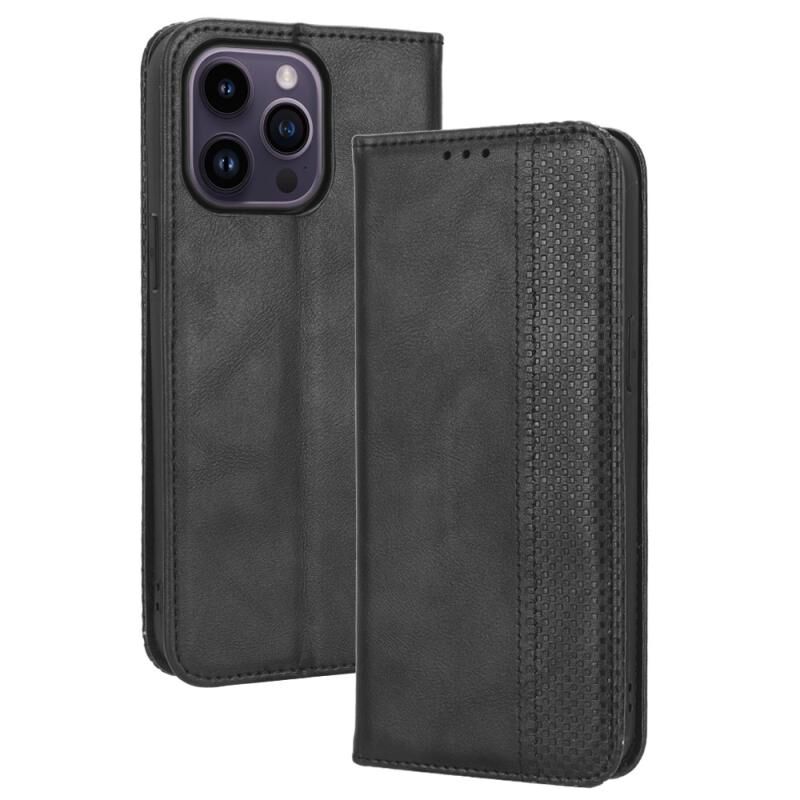 Θήκη τηλεφώνου για iPhone 14 Pro με μαγνητικό κούμπωμα, δέρμα με ρετρό υφή (Μαύρο)
