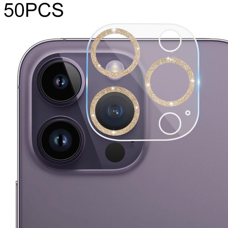For iPhone 14 Pro Max / 14 Pro 50pcs Tempered Glass Glitter CD Texture Back Camera Film(Gold)