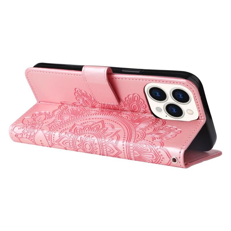 Θήκη δερμάτινη με ανάγλυφα λουλούδια 7 πετάλων για iPhone 14 Pro Max (Χρυσό Ρόδι)