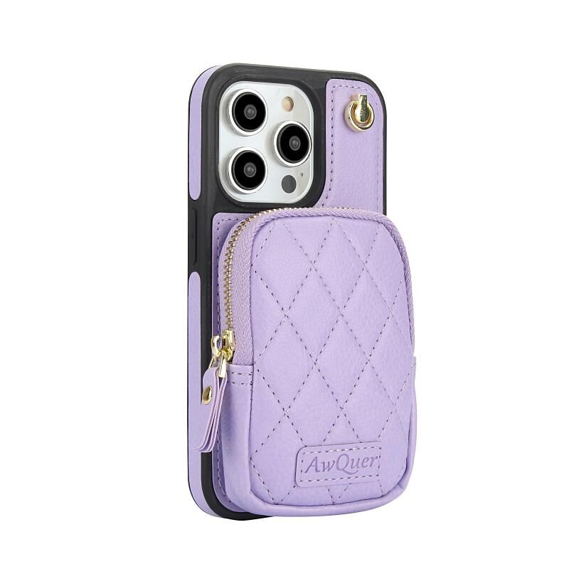For iPhone 14 Pro Max AwQuer Crossbody Zipper Wallet Bag Litchi Leather Phone Case(Light Purple) (Awquer)
