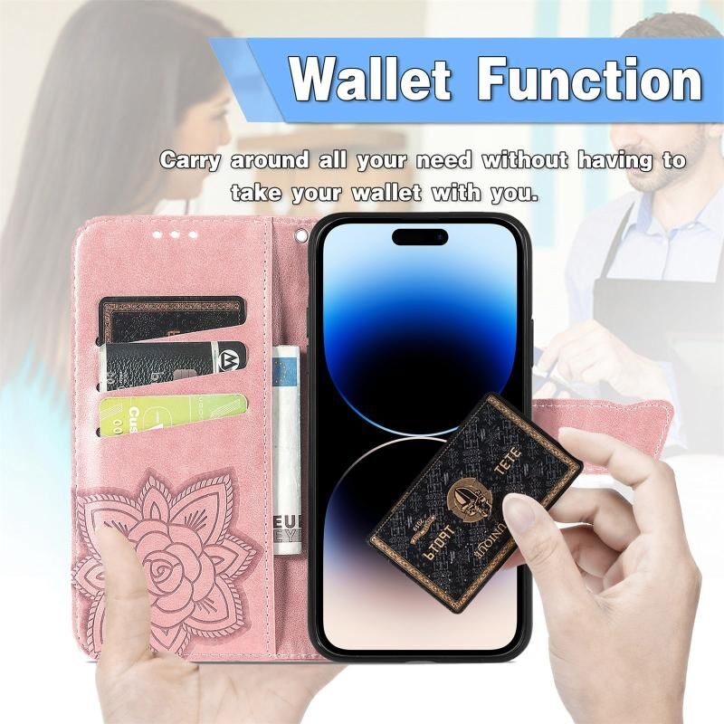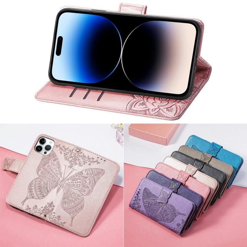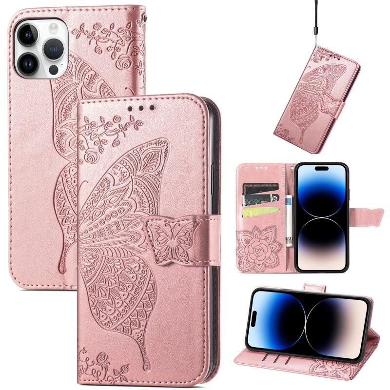 Θήκη δέρματος με ανάγλυφο σχέδιο πεταλούδας για iPhone 14 Pro Max (Ροζ)