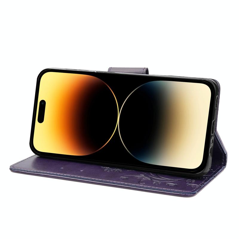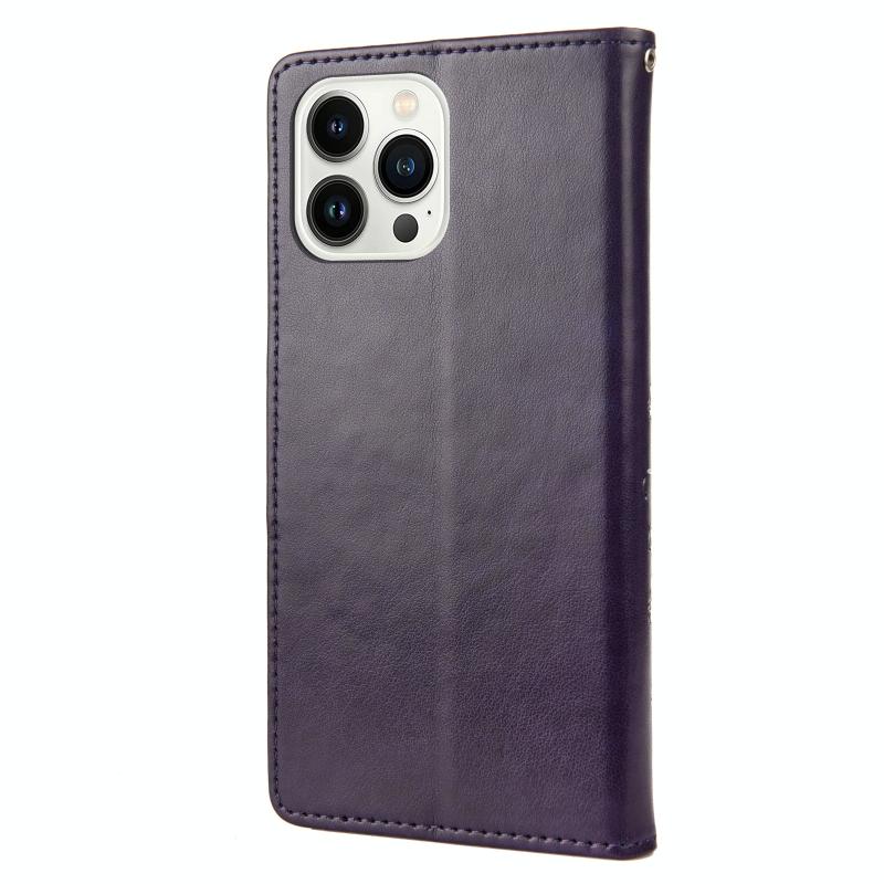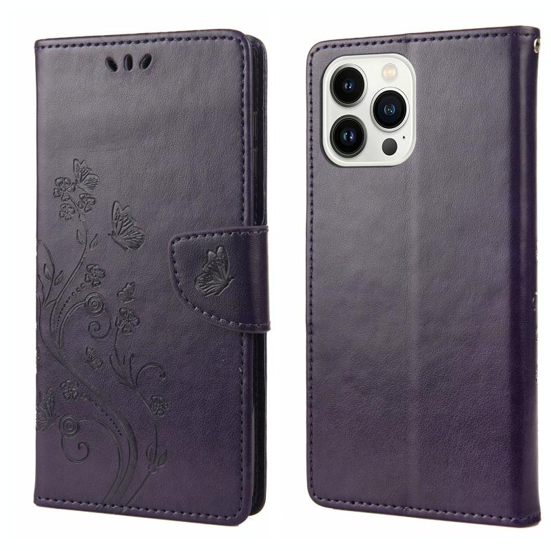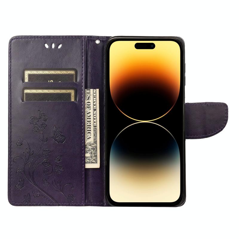 Θήκη τηλεφώνου από δέρμα με σχέδιο πεταλούδας και λουλουδιών, τύπου flip, για iPhone 14 Pro Max (Βαθύ μωβ)