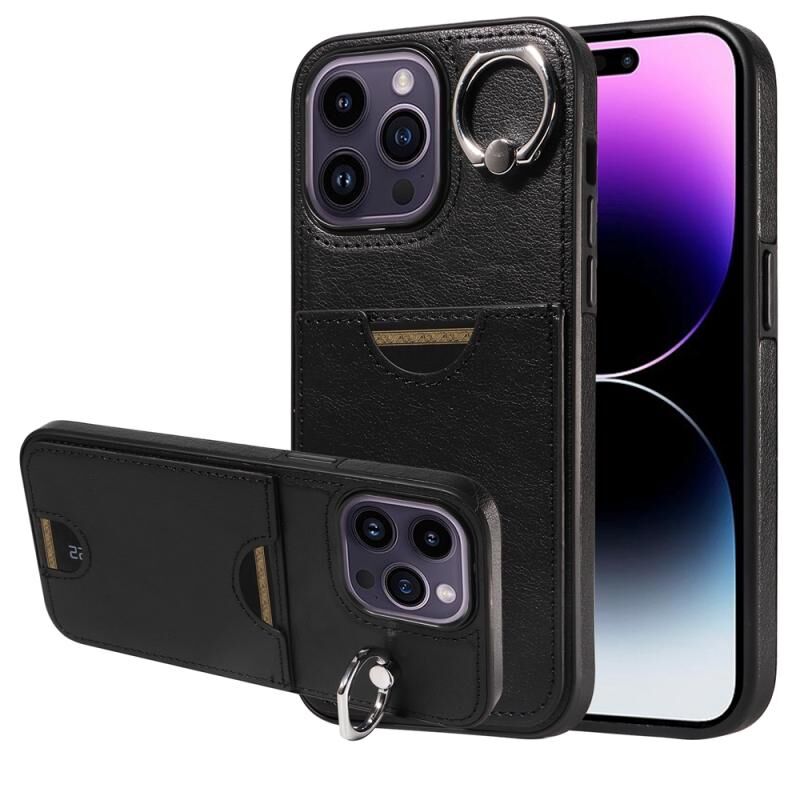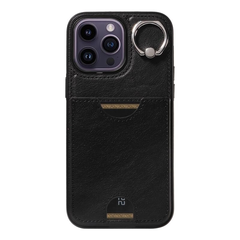 Θήκη τηλεφώνου για iPhone 14 Pro Max με υφή δέρματος μοσχαριού, θήκη κάρτας και δαχτυλίδι στήριξης (Μαύρο)
