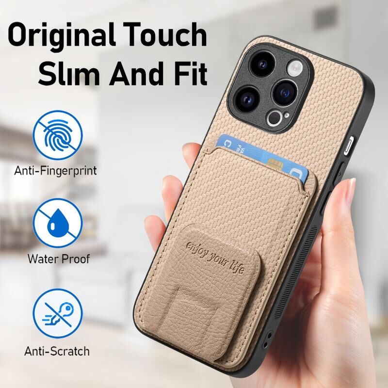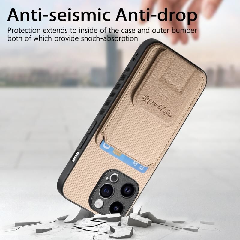 For iPhone 14 Pro Max Carbon Fiber Card Bag Fold Stand Phone Case(Khaki)