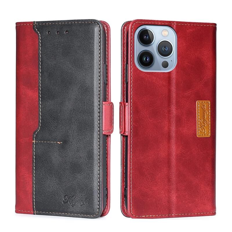 Θήκη τηλεφώνου από δέρμα με πλαϊνή αγκράφα σε αντίθετα χρώματα για iPhone 14 Pro Max (Μωβ + Κόκκινο του Ρόδου)