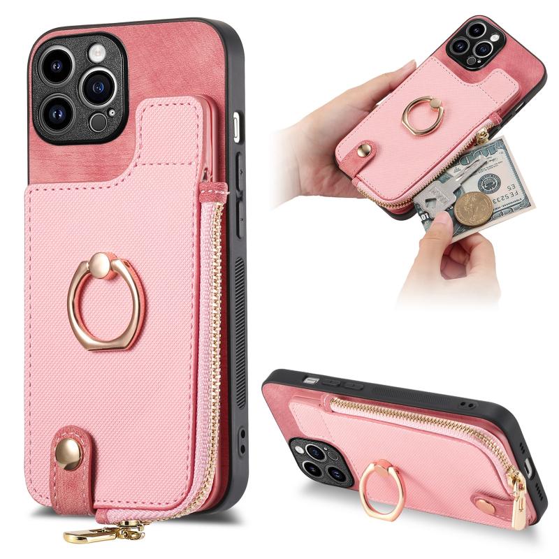 For iPhone 14 Pro Max Cross Leather Ring Vertical Zipper Wallet Back Phone Case(Pink)