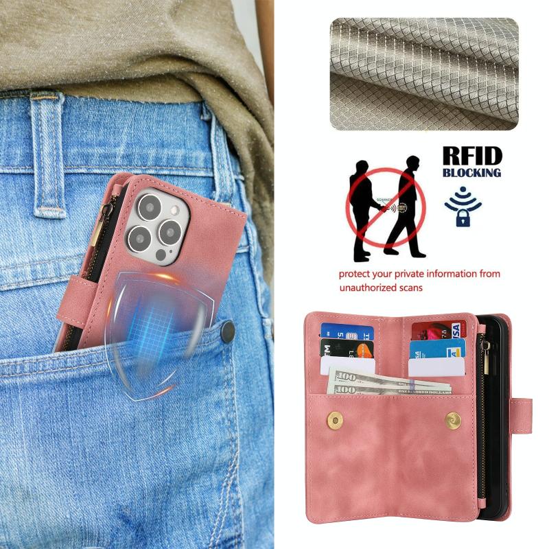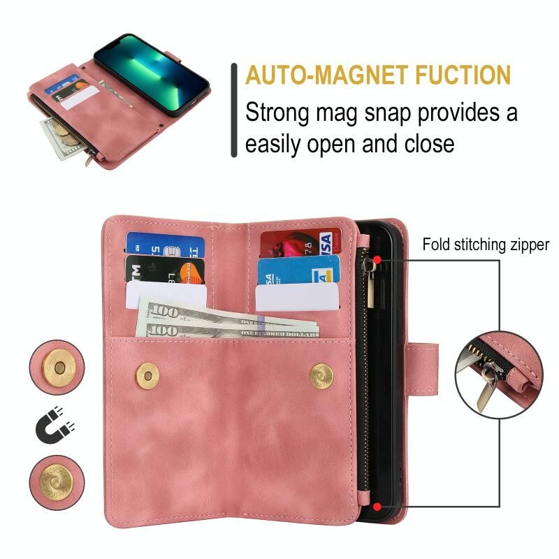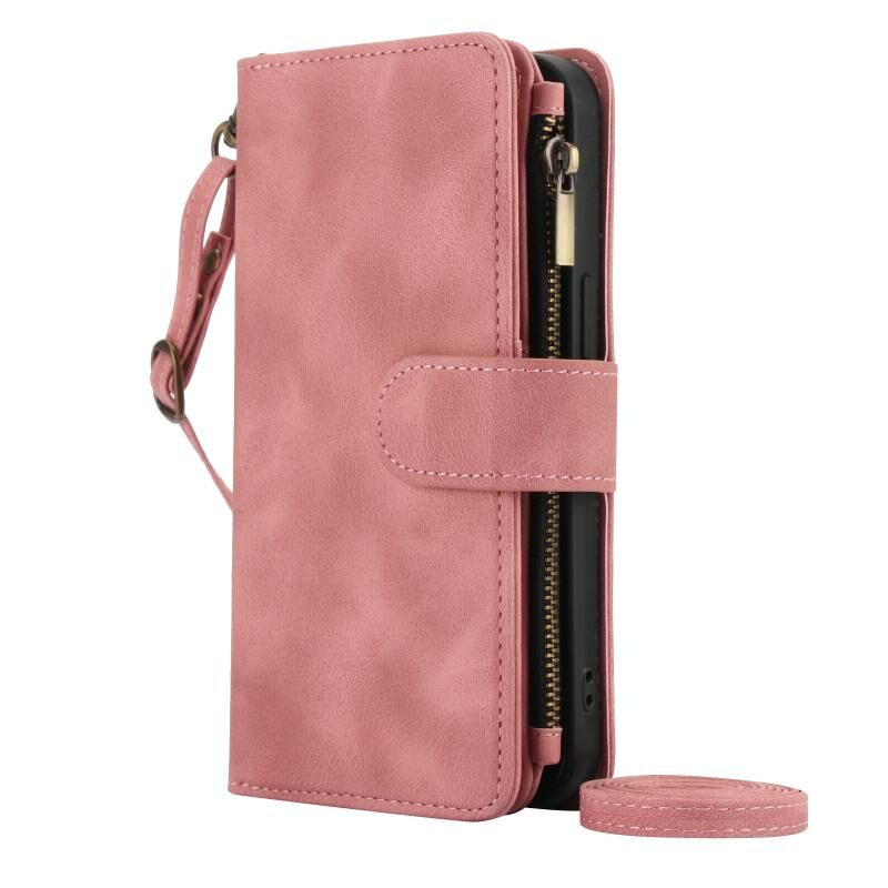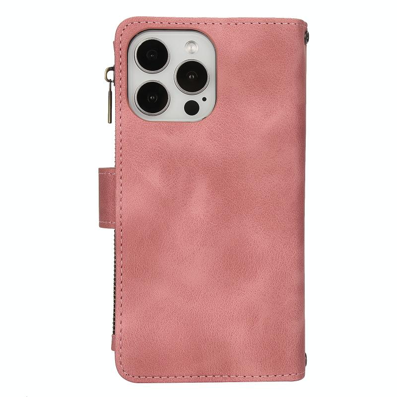 Για iPhone 14 Pro Max Δερμάτινη Θήκη Πορτοφόλι με Φερμουάρ & Λουρί (Ροζ Χρυσό)