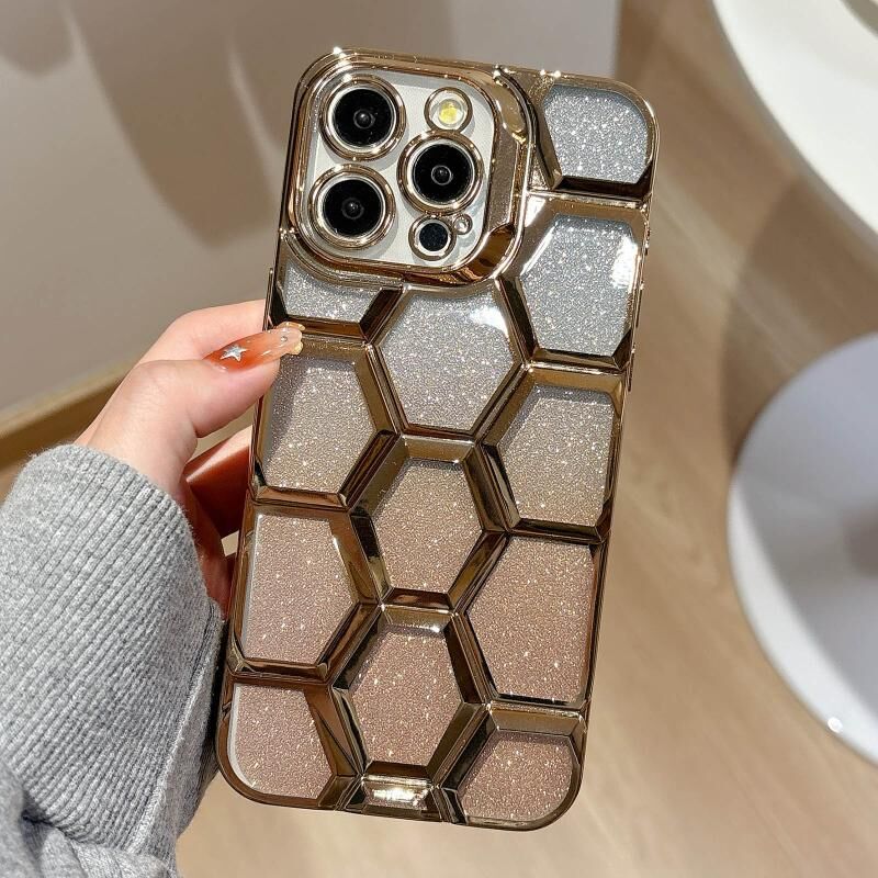 For iPhone 14 Pro Max Electroplating Laser Engraving 3D Honeycomb Glitter TPU Phone Case(Gold)