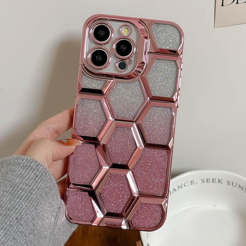 For iPhone 14 Pro Max Electroplating Laser Engraving 3D Honeycomb Glitter TPU Phone Case(Pink)
