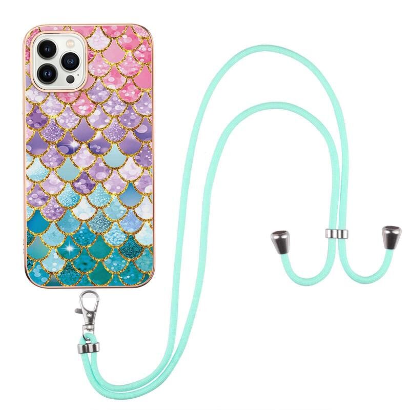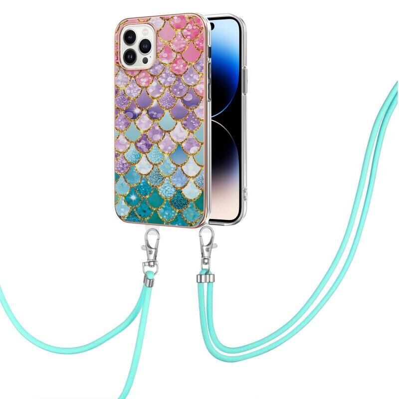 For iPhone 14 Pro Max Electroplating Pattern IMD TPU Shockproof Case with Neck Lanyard (Colorful Scales)
