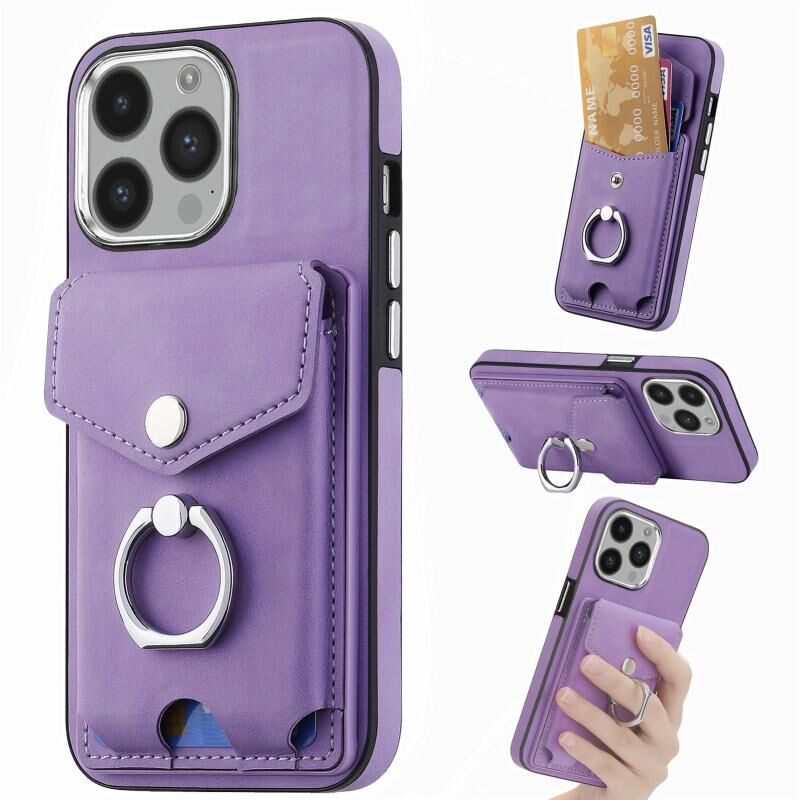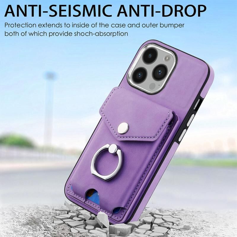 Θήκη τηλεφώνου με δερμάτινη υφή και μεταλλική επίστρωση για iPhone 14 Pro Max, με θήκη για κάρτες και δακτύλιο (Μπλε)
