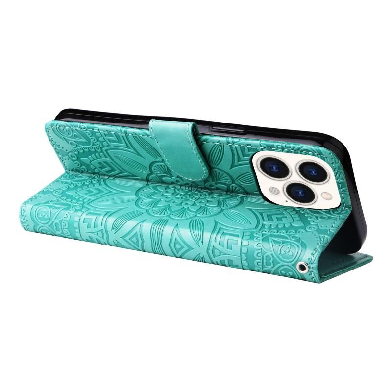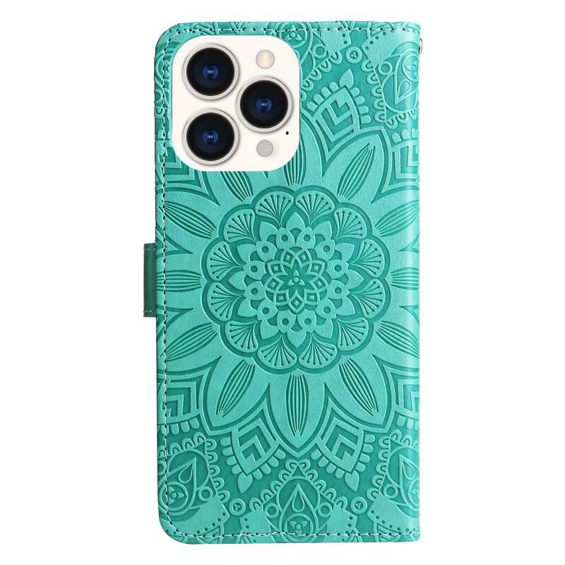 Θήκη τηλεφώνου δερμάτινη με ανάγλυφο ηλίανθο για iPhone 14 Pro Max (Πράσινο)