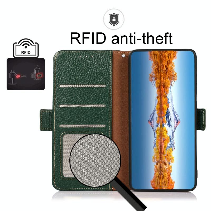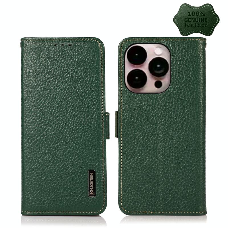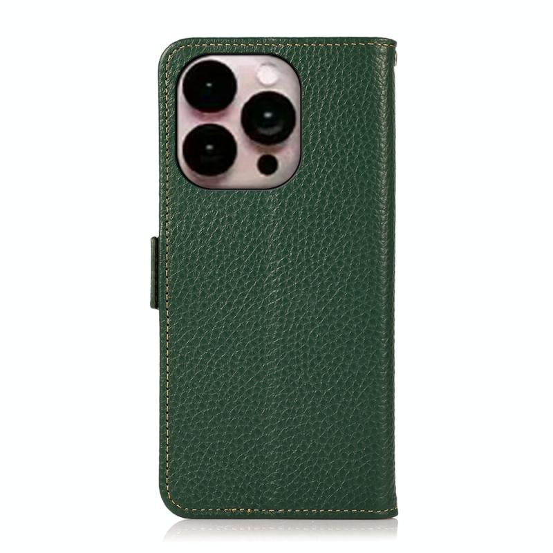 For iPhone 14 Pro Max KHAZNEH Side-Magnetic Litchi Genuine Leather RFID Phone Case (Green)