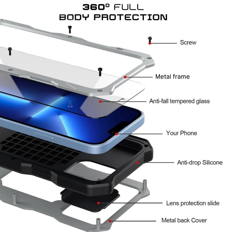 8. Πολυεπίπεδη προστασία, η θήκη κινητού τηλεφώνου αποτελείται από άνω και κάτω καλύμματα από κράμα αλουμινίου και σιλικόνη για την προστασία του τηλεφώνου προς όλες τις κατευθύνσεις