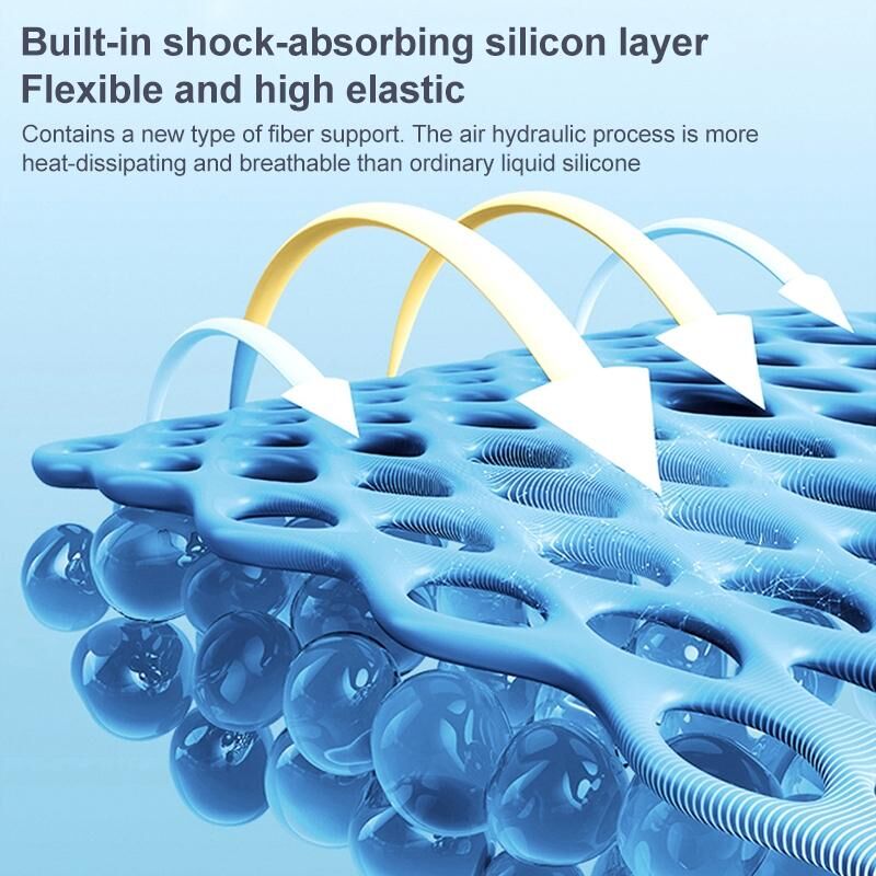 2. Η ενσωματωμένη στρώση σιλικόνης απορρόφησης κραδασμών είναι εύκαμπτη και υψηλής ελαστικότητας και περιέχει υποστήριξη νέας ίνας για να σχηματίσει μια αεροϋδραυλική ροή, η οποία είναι πιο διαχυτική θερμότητας και αναπνεύσιμη από την κοινή υγρή σιλικόνη.