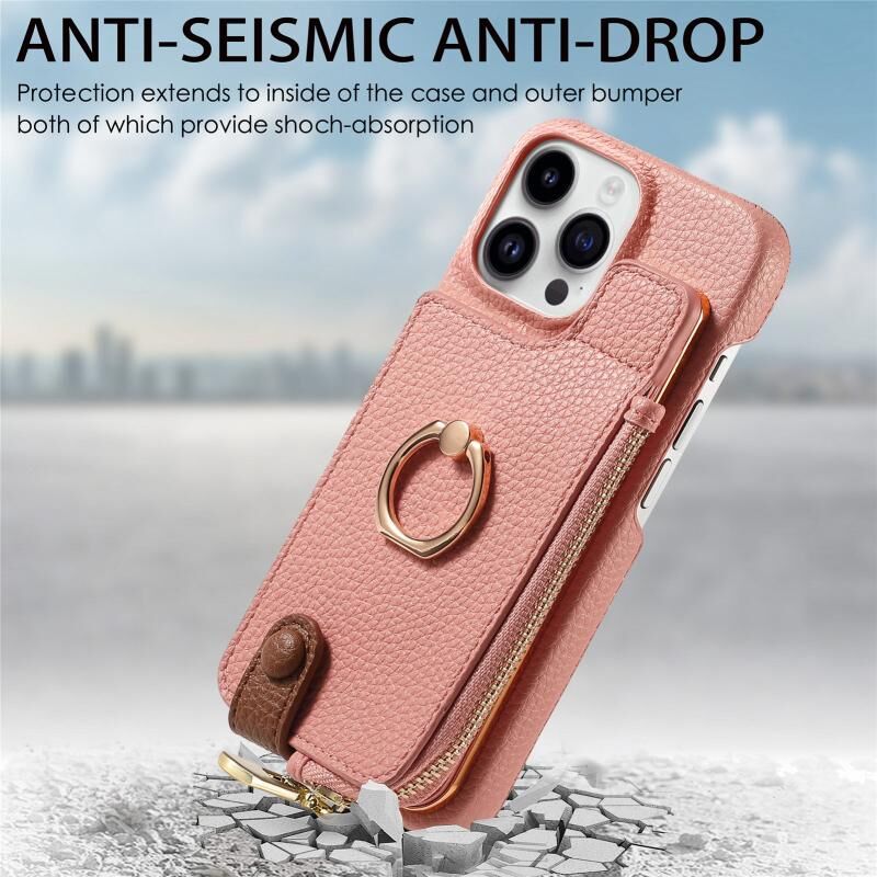 Για iPhone 14 Pro Max Δερμάτινη Θήκη Πορτοφόλι με Φερμουάρ & Δαχτυλίδι (Ροζ)