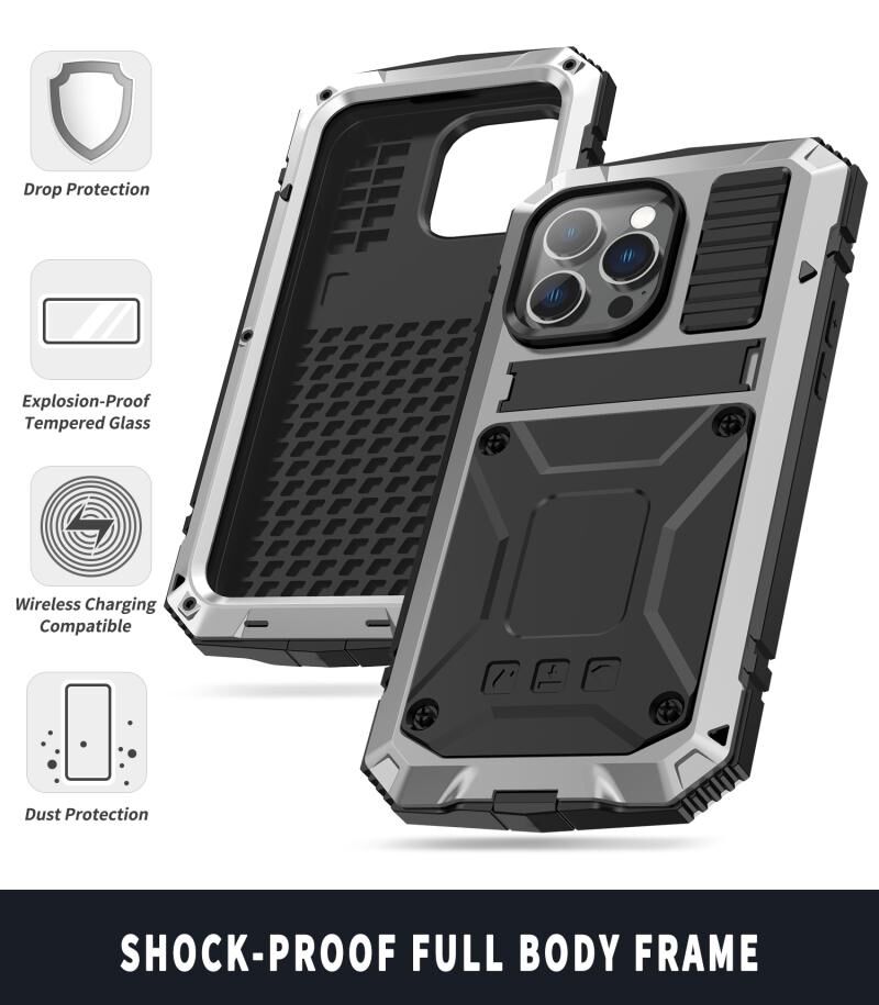 Θήκη για iPhone 14 Pro Max R-JUST ανθεκτική σε κραδασμούς, αδιάβροχη, αδιάβροχη από σκόνη με βάση στήριξης (Ασημί) (R-JUST)