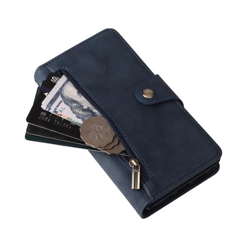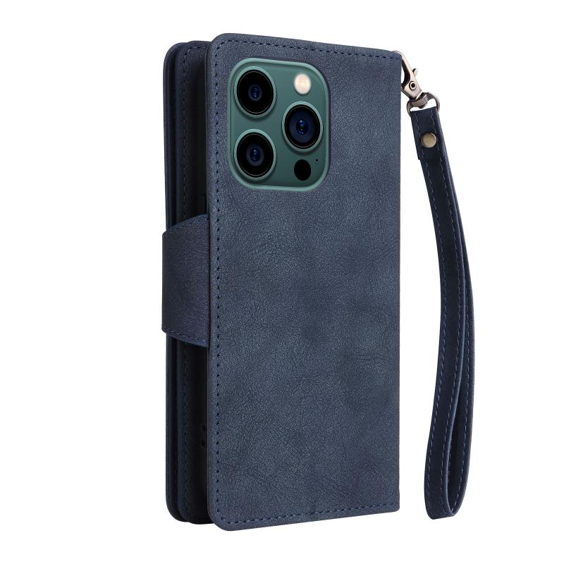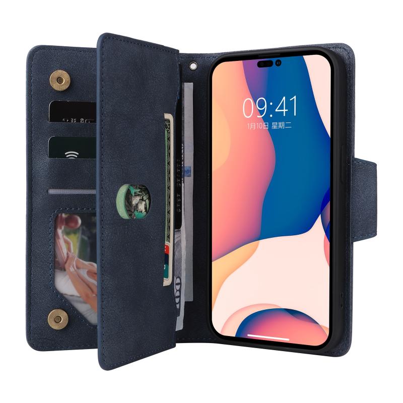 For iPhone 14 Pro Max Rivet Buckle 9 Cards Three Fold Leather Phone Case (Blue)