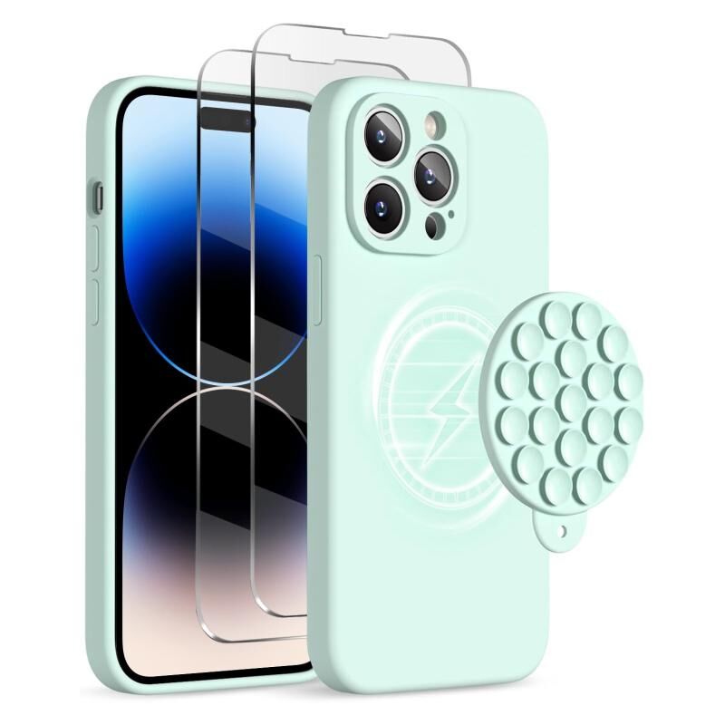 Θήκη τηλεφώνου MagSafe για iPhone 14 Pro Max από σιλικόνη με βεντούζα και προστατευτική μεμβράνη οθόνης (Μέντας Πράσινο)