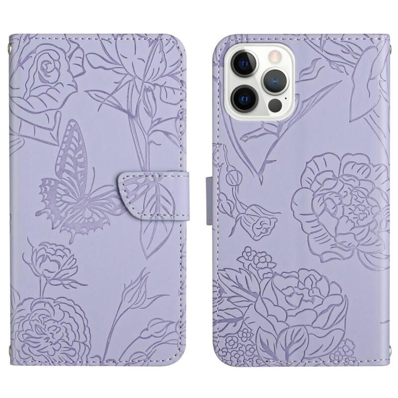 Θήκη τηλεφώνου από ανάγλυφο δέρμα για iPhone 14 Pro Max, αίσθηση δέρματος, με σχέδιο πεταλούδας και παιώνιας (Κόκκινο)