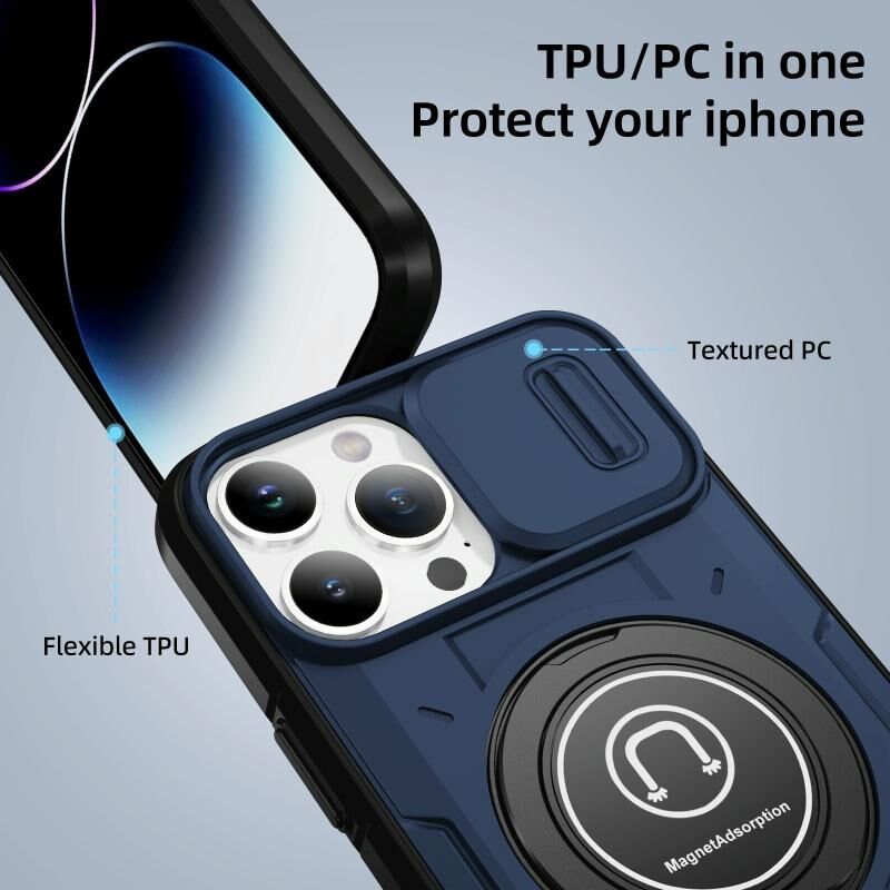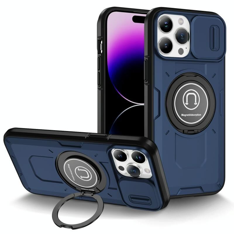For iPhone 14 Pro Max Sliding Camshield TPU Hybrid PC Magnetic Holder Phone Case(Dark Blue)