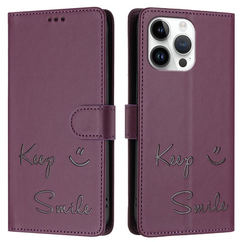 Θήκη τηλεφώνου δερμάτινη με ανάγλυφο χαμόγελο και προστασία RFID για iPhone 14 Pro Max (Βιολετί)