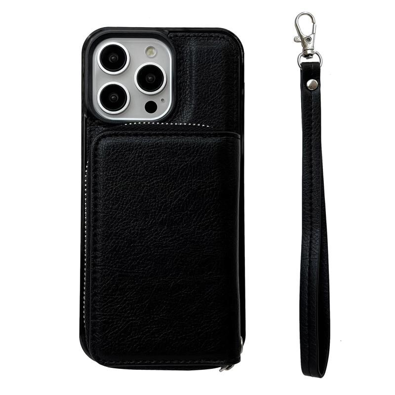 Θήκη τηλεφώνου για iPhone 14 Pro Max, μονόχρωμη με φερμουάρ και 11 θήκες για κάρτες, με κορδόνι (Μαύρο)
