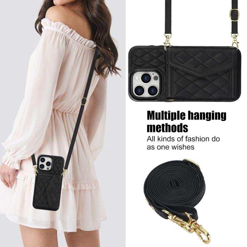 For iPhone 14 Pro Max Splicing Rhombic Texture Card Bag Phone Case with Long Lanyard(Black)