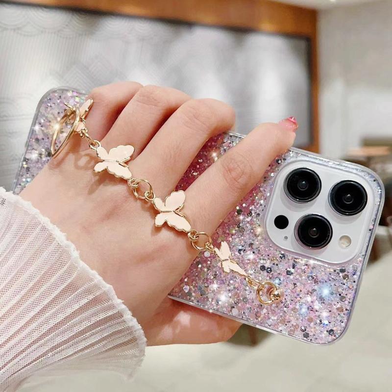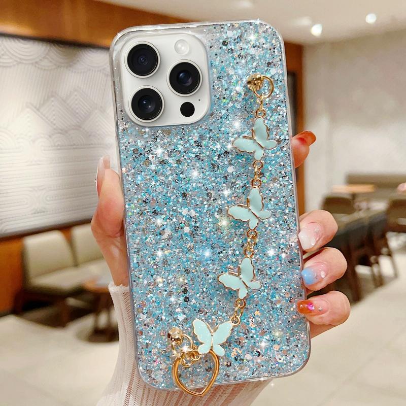 For iPhone 14 Pro Max Starry Sequin Butterfly Chain Epoxy TPU Phone Case(Blue)