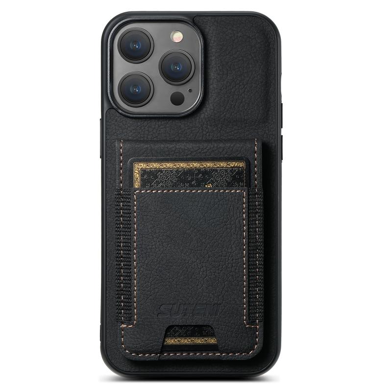 For iPhone 14 Pro Max Suteni H03 Litchi Leather Card Bag Stand Back Phone Case(Black) (Suteni)