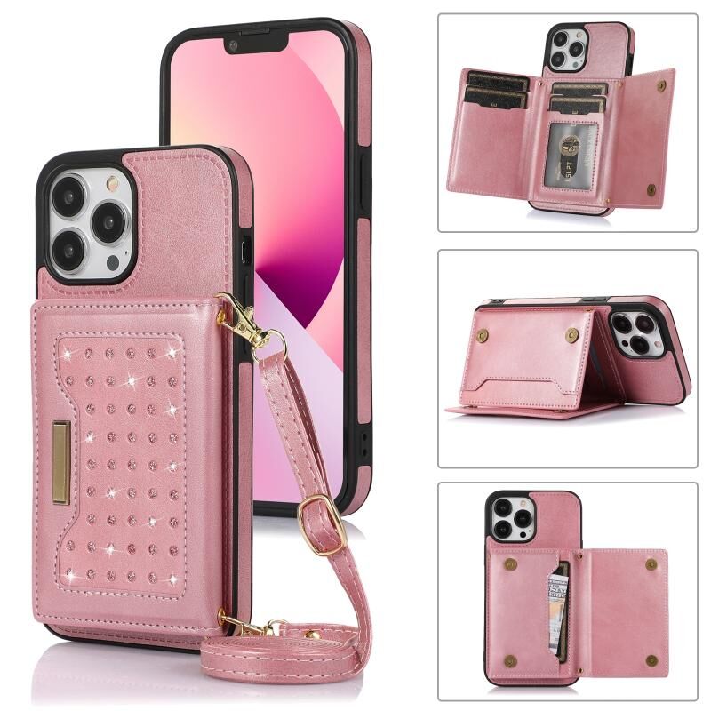 Θήκη τηλεφώνου από δέρμα με προστασία RFID για iPhone 14 Pro Max, τριπλή, με κορδόνι (Μαύρο)