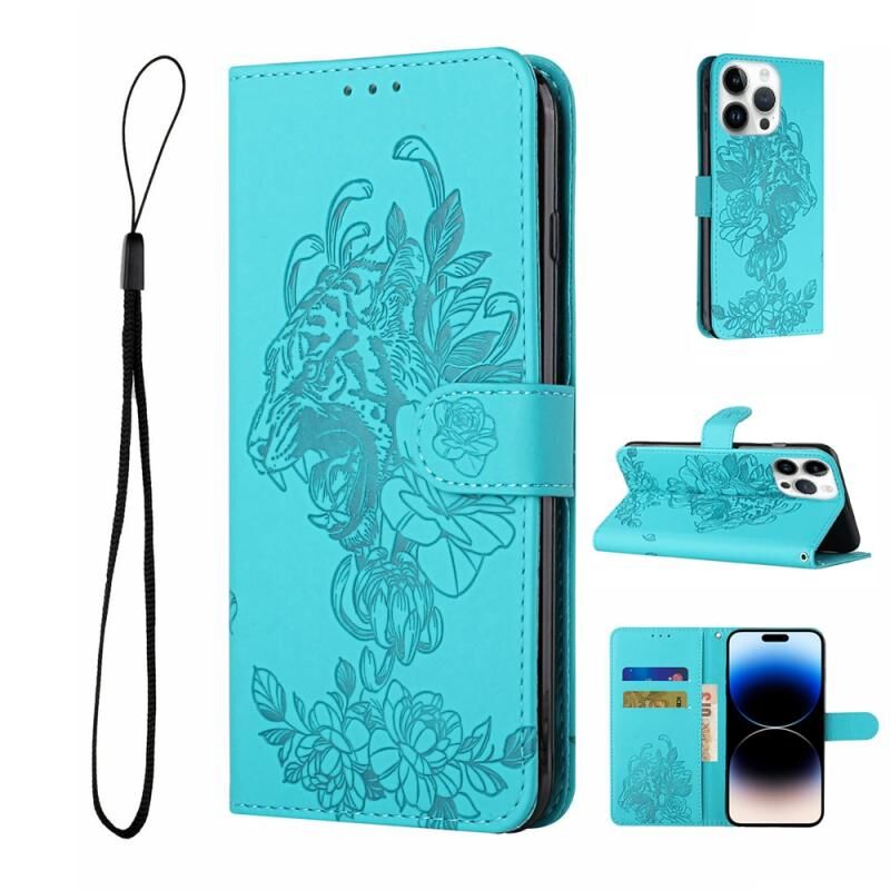 Θήκη τηλεφώνου δερμάτινη με ανάγλυφο λουλουδιού τίγρη για iPhone 14 Pro Max (Γαλάζιο του μωρού)