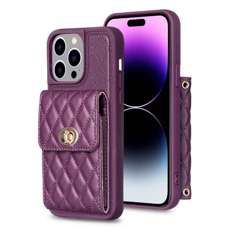 Θήκη τηλεφώνου από δέρμα με ρόμβους και μεταλλική αγκράφα για iPhone 14 Pro Max (Ροζ)