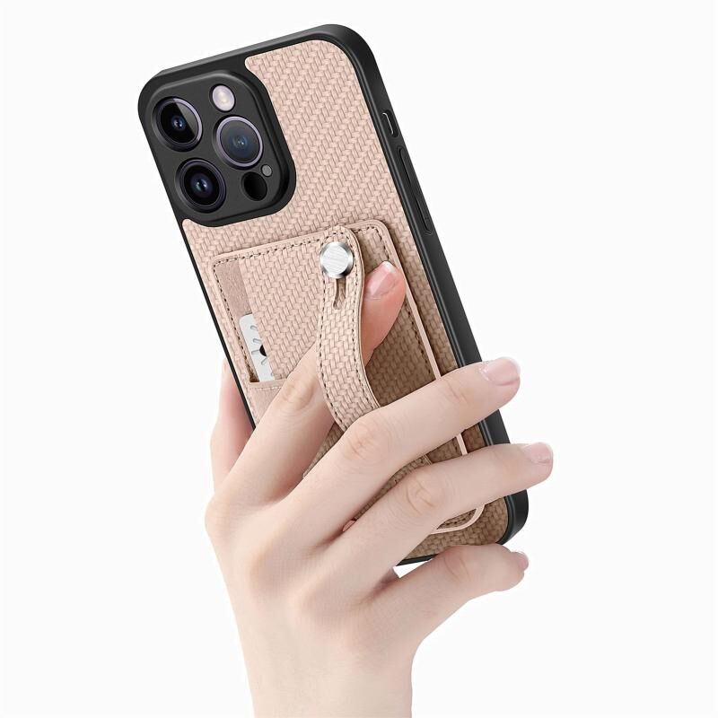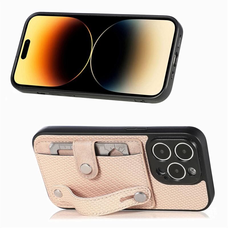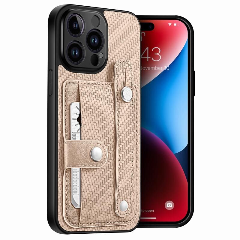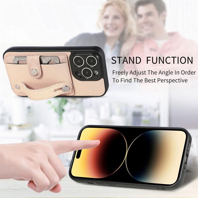 For iPhone 14 Pro Max Wristband Kickstand Card Wallet Back Cover Phone Case with Tool Knife(Khaki)