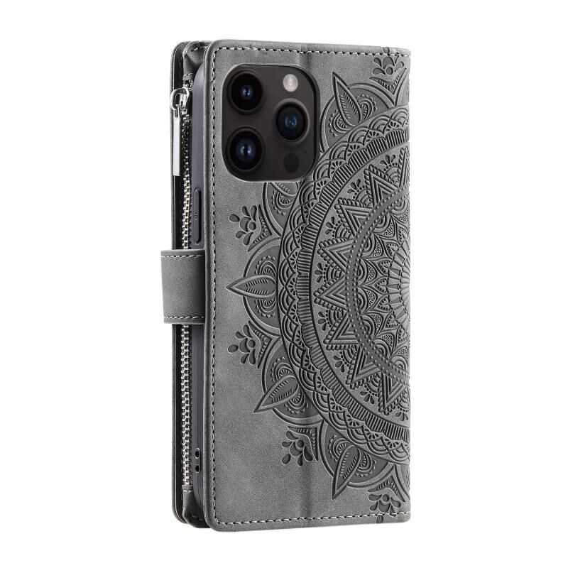 For iPhone 14 Pro Multi-Card Totem Zipper Leather Phone Case(Grey)