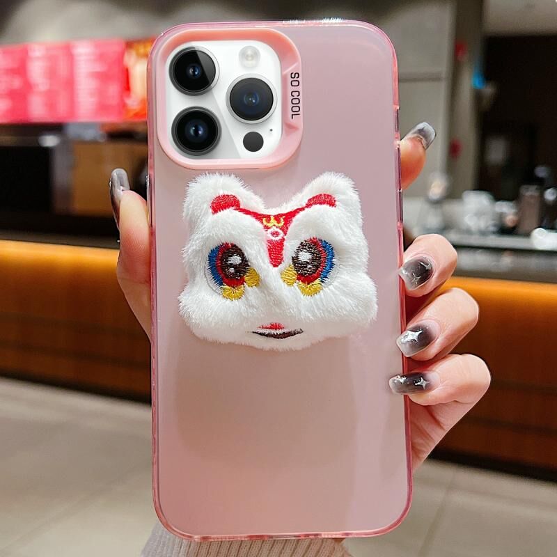 Θήκη τηλεφώνου για iPhone 14 Pro, βελούδινη κούκλα με χορό λιονταριού για την Πρωτοχρονιά (Κόκκινη πλάτη, Κόκκινο λιοντάρι)